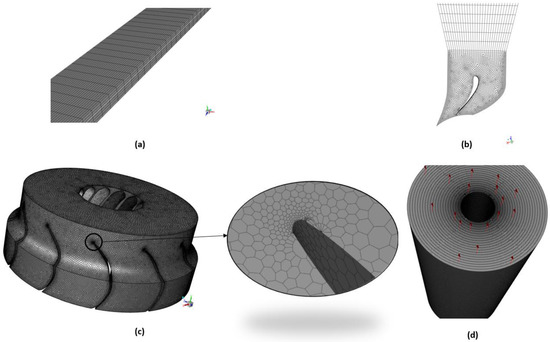 The numerical mesh of the model: (a) the inlet domain, (b) the first-stage nozzle vane domain, (c) the first- and second-stage rotor domain, (d) the outlet domain.