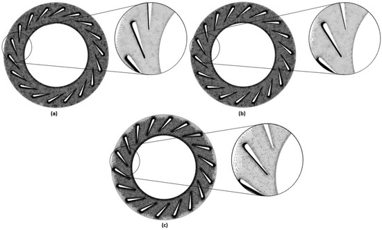 The position of the VTG vanes: (a) 20°, (b) 30° and (c) 40°.