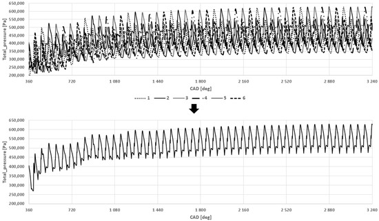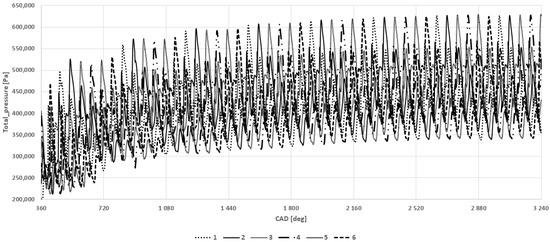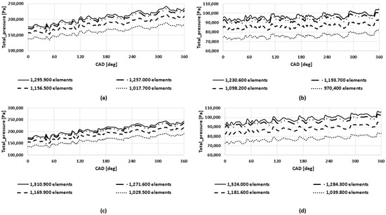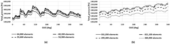 To generate accurate results, the numerical mesh had to be validated. The mesh validation was performed during the single revolution of the crankshaft. For validation purposes, the total pressure parameter was used. The mesh validation was performed for a different number of elements on the critical domains: the exhaust pipes, the first-stage rotor, the VTG vanes, and the second-stage rotor. The mesh validation is shown in Figure 13 and Figure 14.