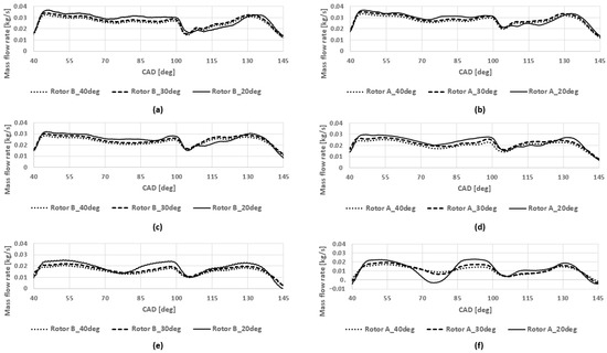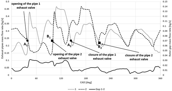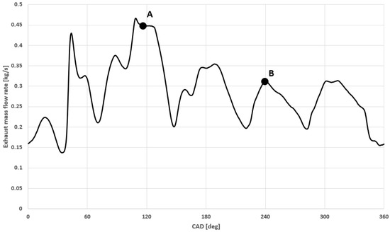 The mass-flow inlet boundary condition was set at the inlet to each exhaust pipe and was obtained from the experimental data generated from the test stand. The tests were performed at the BorgWarner Poland company (Jasionka, Poland). The model was simulated under the pulsatile mass-flow rate of the exhaust gases from the six-cylinder engine, as seen in Figure 11.