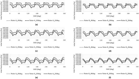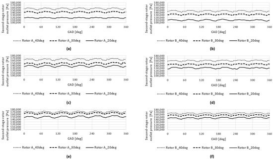 The mesh validation in terms of pressure variation of (a) rotor A—first-stage, (b) rotor A—second-stage, (c) rotor B—first-stage and (d) rotor B—second-stage during the single revolution of the crankshaft.