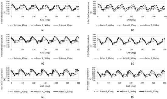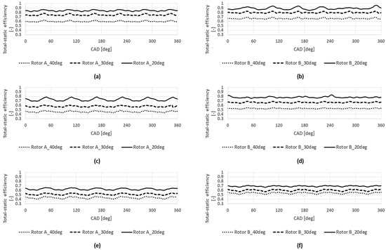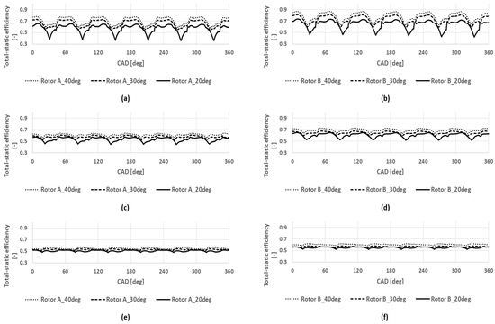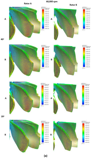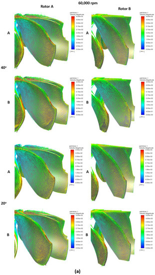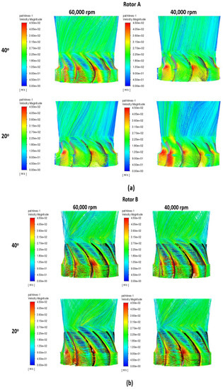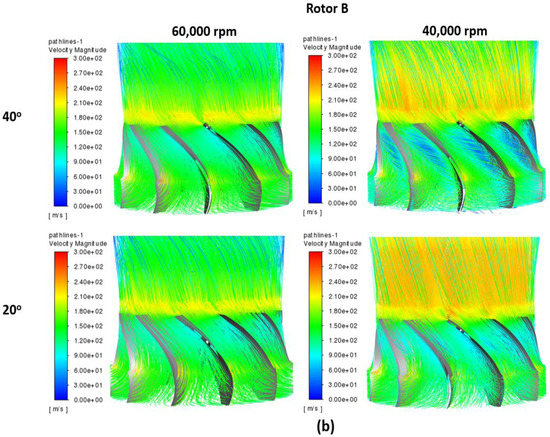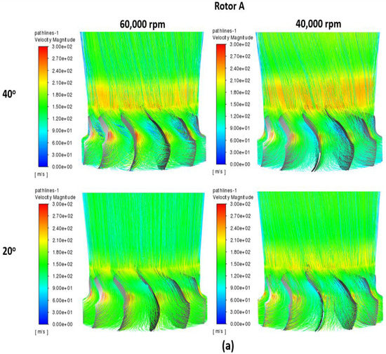 On the other hand, the second-stage rotor enhanced heat recovery with the closure of the VTG vanes. The highest efficiency values of the second-stage rotor were observed at the 60,000 rpm, 20° VTG case for every rotor geometry. The highest flow losses were observed at the blade hub region near the rotor inlet for the rotor A geometry at both stages. For the first-stage rotor A, the flow separation was more evident at the closed position of the VTG vanes. At the second-stage rotor A, the separation area was evident at the opened position of the VTG vanes. However, almost no separation zones were observed for the rotor B blade geometry at each stage. Thus, the rotor B geometry provided the highest total efficiency of the two-stage turbine system with the value of 57%.