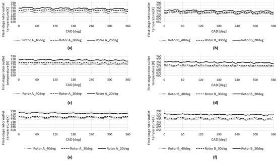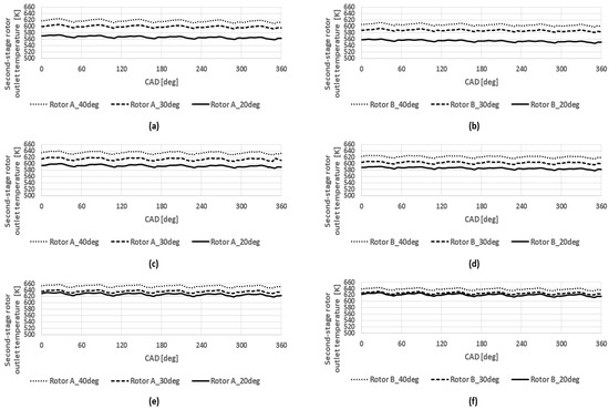 The rotor B geometry provided a higher performance of the first- and second-stage rotors. The higher pressure ratio and lower outlet temperature for the first-stage rotor B was achieved due to the smaller blade number than rotor A. Thus, rotor B was less affected by the closure of the VTG vanes. The rotor B geometry at the second stage provided higher pressure ratio values and lower outlet temperature values than rotor A at each turbine speed. The highest temperature drop difference between rotors A and B was 11% at the first-stage rotor and 58% at the second-stage rotor. The authors concluded that the state-of-the-art rotor B, with the exact same dimensions as rotor A, could provide higher performance than the older rotor A.