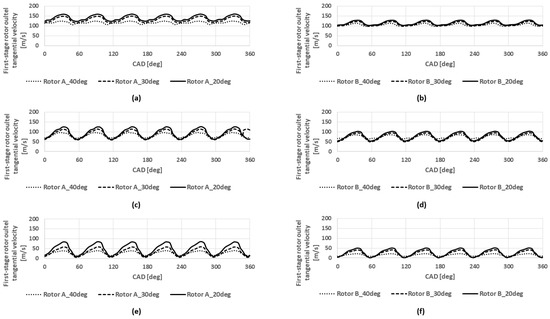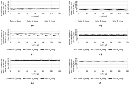 The analysis of the tangential velocity component at the outlet from the first- and second-stage rotors showed an increased turbulent flow. The closure of the VTG vanes increased the tangential velocity at the first-stage rotor outlet, which resulted in high flow deviation of the exhaust gases from the axial direction. However, the opposite behavior was observed at the second-stage rotor, as the closure of VTG vanes promoted axial flow of the exhaust gases. Rotor B provided lower values of the tangential velocity for every stage, which led to the less turbulent flow than in the case of the rotor A geometry.