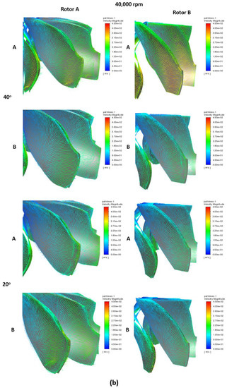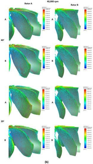Figure 3 shows the changes in theta and beta angles at the hub and shroud along the blade length from the leading edge (LE) to the trailing edge (TE). As can be seen, the highest deviation between rotors A and B can be observed at the trailing edge. The negative sign indicates that the blade deviates opposite to the rotation of the rotor. At the hub, the theta angle difference between rotors reaches 10° at the TE, while the beta angle difference reaches 17° at the TE. The stress requirements limit such differences. Higher difference values can be observed at the shroud, where the geometry is not limited by the mechanical stress but by the flow losses. The theta angle difference is significant at the shroud compared to the beta angle. The difference in theta angle at the TE reaches 21°, which indicates that the blades of rotor B have a higher deviation in the opposite direction to the rotation. The beta angle difference reaches 12.5° at the TE, which indicates that the blades of rotor B are less twisted than the blades of rotor A. This might lead to a smaller flow circulation at the outlet from rotor B.