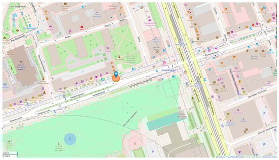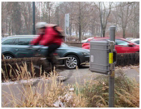 Figure 3). It was characterized by the immediate vicinity of a public park, Pole Mokotowskie, and was located approximately 3 km from the city center. Such locations are often characterized by the highest bicycle traffic volume in the direction of the city center from 7 a.m. to 9 a.m. (morning rush hours) and from 3 p.m. to 6 p.m. (afternoon rush hours) [