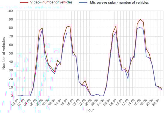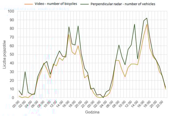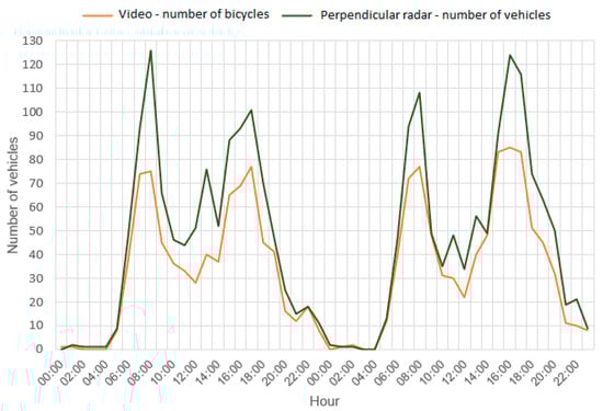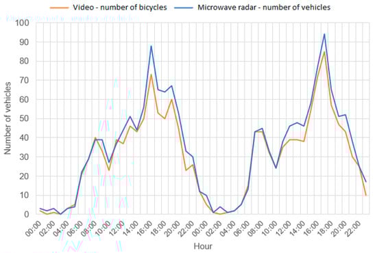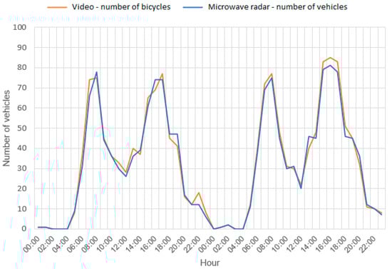 Figure 5) below show the traffic volume measured at particular hours over the two measurement days. The first one shows a comparison of the number of vehicles recorded by the microwave radar and the actual number of bicycles. The second one illustrates a comparison of the number of vehicles measured with the microwave radar and the number of vehicles crossing the measurement section.