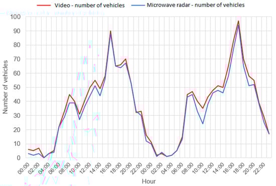 Comparison of the number of vehicles recorded by the microwave radar with the actual number of vehicles crossing the measurement section (own study).