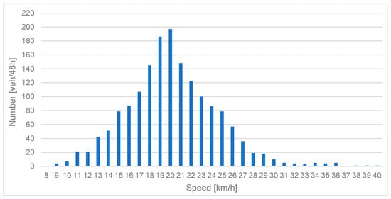 Besides measuring the number of vehicles, the radar also measured their speed; in the case of the station at Stefana Banach street, the average value was 15.22 km/h. Factors that could have impacted this result include the vicinity of an intersection with traffic lights, which was located approximately 30 m from the measurement section. In addition, the studied bicycle lane section passed a pedestrian crossing. People moving with the use of vehicles should exercise particular caution due to the proximity of a bus stop and the resulting increased pedestrian traffic. The graph (