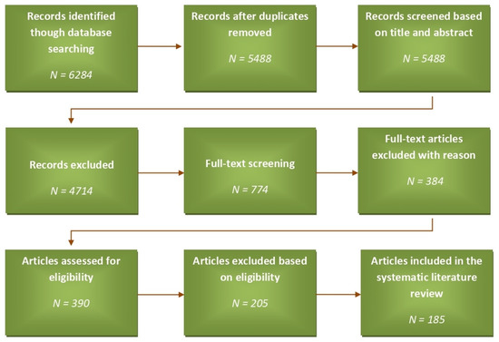 The procedure was followed as illustrated in Figure 1. After checking the reliability of the results in relation to the framework established for the literature review [44], the final count yielded 185 relevant articles.