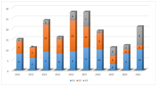 Distribution of selected studies by year of publication and the three category Groups (2012–2021).