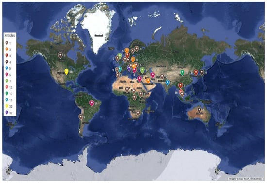 Visual capture of the examined 185 articles (the studies refer to 39 countries) on a global map image.