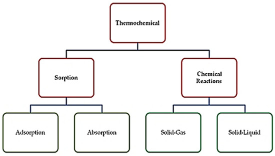 Based on the storage mechanism, TCES processes are divided into sorption processes and reversible chemical reactions [9,13,28]. Figure 1 shows the classification chart for TCES systems. However, there appears to be a thin boundary for clear distinction between terminologies such as chemical storage, thermochemical storage, and sorption processes [27]. Often, a sorption process is considered a chemical reaction in which the chemical bonds are weak [29].