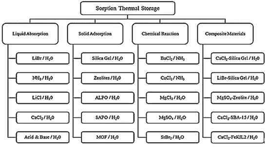 Materials for sorption processes are usually solids, liquids, and composite sorbents with solid/gas and liquid/gas systems as working pairs [13]. Moreover, reversible adsorption of vapours onto porous solid surfaces is a potential option for TCES, particularly for space heating applications [32]. According to Yu et al. [30], the most studied adsorbents are silica gels and zeolites using water as a working fluid. In particular, zeolite 13X is the commonest and most widely studied TCES material because of its hydrothermal and mechanical stability and corrosion behaviour [13], although aluminophosphates (AlPOs), silico-aluminophosphates (SAPOs), and metal-organic frameworks (MOFs) have recently been reviewed by Makhanya et al. [35] as promising materials for heat storage. Composite materials formed by a combination of salt hydrate and a porous additive with high thermal conductivity have also been studied [16]. Figure 2 shows a summary of typical sorption reactions and materials.