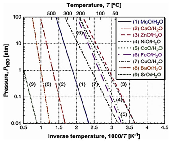 Thermochemical heat storage with metal hydroxides results from a reversible reaction of water (steam) and metal oxides at high temperatures (~500 °C) and near-atmospheric pressures [8]. The alkaline earth metal hydroxides such as Mg(OH)2, Ca(OH)2, Sr(OH)2, or Ba(OH)2 have been considered as storage materials [39]. The initial candidate hydroxide–oxide pairs are Mg(OH)2/MgO, Ca(OH)2/CaO, Sr(OH)2/SrO, and Ba(OH)2/BaO. The theoretical turning temperatures and thermodynamic data of these hydroxides are presented in Table 3. The reactions are in the range of 70–1005 °C, though most of the reactions are too low for high-temperature application [11], usually occurring at medium temperatures of 250 ˂ T ˂ 450 °C. The steam partial pressure and the temperature drive the hydration/dehydration reactions [12]. Figure 4 shows some of the couples which could be used for TCES application.