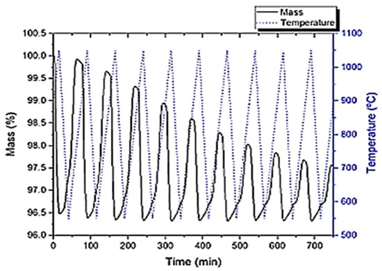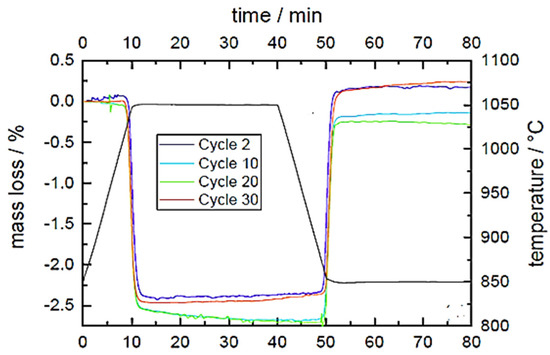 Weight-change curves during 10 Mn2O3/Mn3O4 TGA cycles between 500 and 1100 °C [109].
