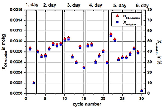 Andre et al. [110] studied the impact of Fe, addition which decreased the redox activity and energy storage capacity of Co3O4. However, the cycling stability of Mn2O3 was significantly improved with added Fe amounts above 20 mol% while the energy storage capacity was unchanged. Similarly, a mixed oxide of Co-Cu-O with low amounts (<10 mol%) of Cu showed very good cycling stability and higher reaction enthalpy than the others (Mn-Cu-O and Co-Mn-O systems) [108]. Neises et al. [111] performed 30 cycles on a 5 wt% Al2O3-doped Co3O4 without any material degradation but yielding only a 50% conversion. This was attributed to the insufficient stirring and mixing of the metal oxide particle bed inside the reactor. Notwithstanding, about 400 kJ/Kg energy density was achieved per cycle. The graphical presentation of oxygen absorbed per mol of the doped Co3O4 during reduction is shown in Figure 8.
