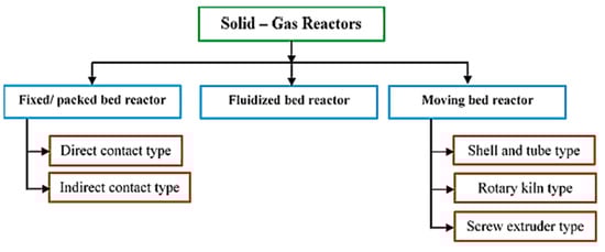 Reactors provide the platform for the operation of thermochemical storage systems. To guarantee efficiency in the charging and discharging process of the TCES material, an innovative reactor concept fashioned for particular operation and storage material is necessary [124]. That is, the nature of reactants or the type of reaction determines the type and design of the reactor and the system integration. Additionally, the art of designing efficacious reactors is as important as material enhancement itself. Different criteria have been used to classify reactors, such as operation mode, number of phases, reaction types, or a combination of these [125]. Based on the mode of operation, three major solid–gas reactors are implemented: fixed (packed)-bed, moving-bed, and fluidized-bed reactors [8], as shown in Figure 9.