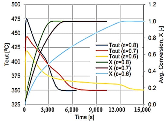 Fixed-bed reactors are the most common lab-scale test rigs and have been investigated by Schmidt et al. [126]. In this work, several dehydration and hydration cycles were performed to study the charge and discharge characteristics of a 20 kg Ca(OH)2 material. The dehydration was performed at 45 °C and the rehydration at about 55 °C. A conversion of 77% without degradation after 10 cycles was achieved. Investigation of different charging and discharging temperatures was then recommended to optimize the overall conversion of the material. Again, Ranjha et al. [127] modelled a two-dimensional rectangular bed filled with CaO/Ca(OH)2 powder for different flow geometries and bed properties. They showed that increasing the porosity of the bed provided higher energy density but slowed the reaction, resulting in a lower average outlet temperature. A possible remedy for this deficiency would be to increase the bed dimensions, but this could result in a slower reaction owing to the poor thermal conductivity of the materials. This suggests that a systematic optimization process could be applied as a compromise between various parameters. However, this depends on the desired output temperature, energy requirements, and the rate of thermal energy storage and retrieval. Figure 10 shows the results of comparing varying bed porosities with total conversion time and the maximum outlet temperature in counter-current flow geometry.