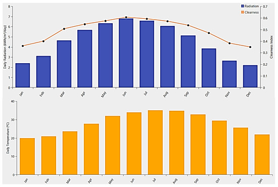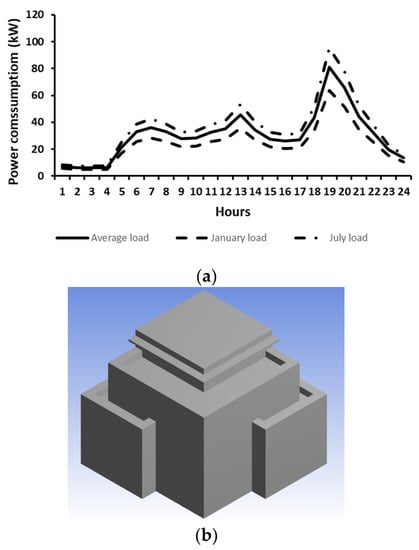 A commercial office building in Sharjah emirate (UAE) is the case study of this paper. The office building is located at a latitude and longitude of 25°16′ and 55°19′, respectively. According to Figure 1, the months with the highest and lowest solar insolation levels are June and December. The load includes both the thermal and electrical energy of the building, such as the cooling load, lighting, and appliances. Figure 2 depicts the three-dimensional (3D) geometry of the commercial office structure in Sharjah.
