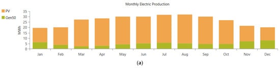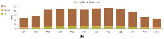 Monthly average electrical power supply from both hybrid systems for the office building in Sharjah city in UAE. (a) hybrid solar PV-DG-BES and (b) hybrid solar PV-DG-FC-BES systems.