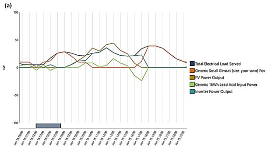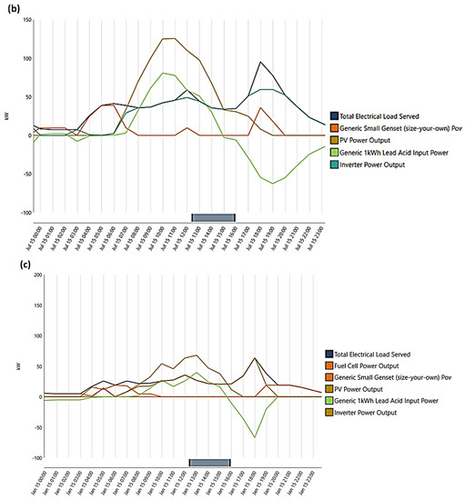 Figure 5a–d shows the hourly electrical power basis for both of the hybrid systems on the minimum and maximum loads in the months of January and July. The only curve that was below the x-axis is the BES curve when it is working in the discharging mode. The hourly electrical power basis for the PV-DG-FC-BES system is also shown for the month of March where all the hydrogen (green) produced from the solar PV system and the diesel fuel consumption is zero.