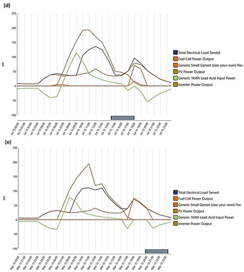 Hourly electrical power supply for (a) PV−DG−BES, January, (b) PV−DG−BES, July, (c) PV−DG−FC−BES, January, (d) PV−DG−FC−BES, July, (e) PV−DG−FC−BES, March.