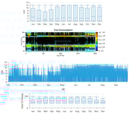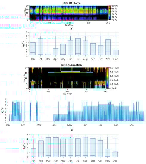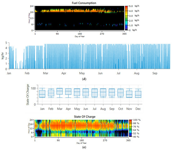 Figure 6a,b represents the performance of the PV-DG-BES system. As expected the system depends on both PV and DG to produce power with any excess of electrical power produced being sent to BES for storage. The PV-DG-BES system relies heavily on the PV for electric power production due to shorter daylight hours (winter session) and the abounded insolation in the UAE throughout the year. Whereas the diesel fuel consumption and the SOC were very high in the summer season due to longer daylight hours even though the amount of insolation is at its highest in comparison to the rest of the year. The highest fuel consumption of DG occurs at 6 PM corresponding to the time of peal load as shown in the hourly and daily mapping distribution in Figure 2a. On the other hand, Figure 6c–e shows the level of fuel consumption (diesel), fuel stored (hydrogen), and the battery’s electrical charge or state of charge (SOC). The monthly fuel consumption amount was very high during the winter season due to the decrease in solar radiation in Sharjah during this period of the year. Moreover, the monthly fuel storage amount was very high during April and May due to the better performance of the solar PV, which was working at the optimum operating temperature. Similar to the fuel consumption, the amount of electrical storage or SOC of the battery was very low due to the aforementioned reason for the fuel consumption. Moreover, the level of diesel fuel consumption, the level of hydrogen storage, and the SOC are shown in Figure 6c–e, respectively, based on the hourly and daily mapping distribution. This mapping distribution clearly shows how the hybrid solar PV, DG, FC, and BES provides electrical power for the office building in Sharjah. This mapping distribution reflects how the hybrid energy system meets the load profile of the office building. Moreover, the highest fuel consumption occurs at 6 PM, corresponding to the load peak, while the highest fuel storage also happens at 6 PM in the months of March and April due to the best performance of solar PV and in August due to a long time of operation. Furthermore, the SOC for the battery has the highest and lowest values in the afternoon and before sunrise due to the full charging process and the full discharge process.