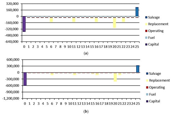 Cash flow for both hybrid energy systems (a) PV−DG−BES (b) PV−DG−FC−BES.