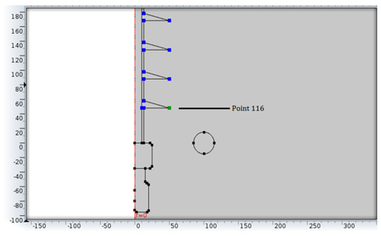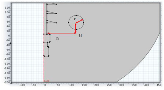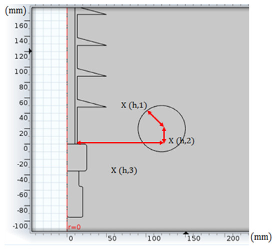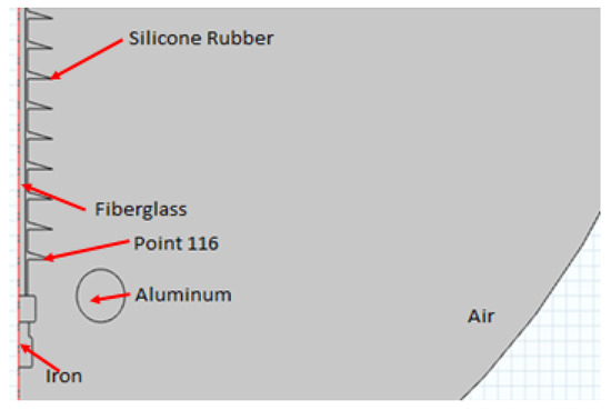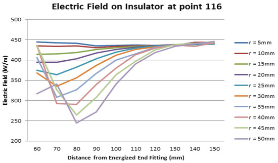 To analyse the effect of the variable parameters on the design at point 116 (referring to Figure 1), the electric field was computed for the practical values of R, r and H separately, while making the other parameters constant. In this section, the simulation processes were done for all the selected parameters. The results of the electric field [kV/cm] were collected. The variation in the ring diameter, R, is between the ranges of 60 mm and 150 mm, whereas the variation in the diameter of the ring tube, r, is between 5 and 50 mm. The vertical position of the ring, H, was fixed at 0 for all the simulation steps. Figure 8 shows the selected point 116, along the insulator string surface, where this is the point that has a high electric field without a corona ring.