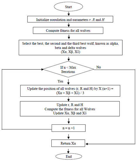There are four groups in grey wolf: the leader wolf α, the captain wolf δ, the deputy leader wolf β and the individual wolf ω [20]. The α, β and δ determine the pursue position and the other wolves will update their position randomly around the pursue. This step is continued until the required condition is met [29]. The steps of the GWO algorithm are illustrated in Figure 4.