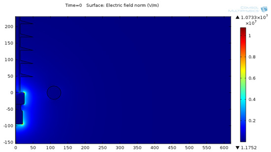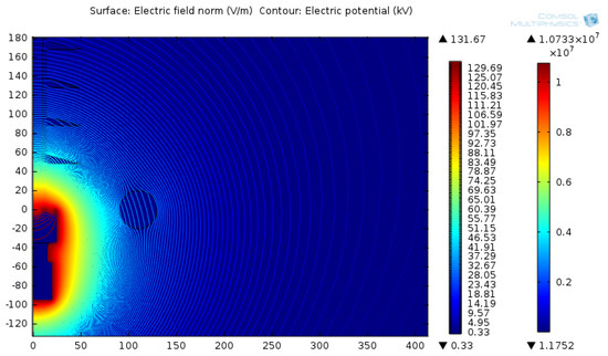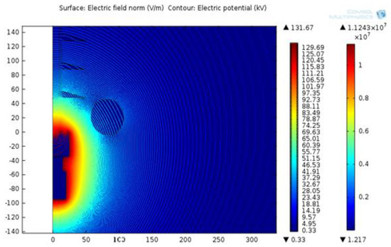 The simulation results for the 132 kV of the insulator string with the corona ring model that has been designed are presented in this section. The simulation results of electric potential distribution and electric field distribution were optimised with and without a corona ring using different dimensions and were compared with the results using non-linear optimisation methods. The distributions of the electric field and electric potential around the energised end along the insulator are examined using COMSOL Multiphysics. The comparisons are done for the two-dimensional (2D) simulation models and the critical points affecting the simulation accuracy are examined. The maximum recommended electric field by the IEEE task force is 4.5 kV/cm. The attachment of the corona ring to the insulator aids the system with a lower corona effect, hence prolonging the insulator life, minimising the maximum electric field along the surface of the insulator and avoiding an excessive level of radio interference. Figure 6 and Figure 7 show the electric potential and electric field distribution obtained from the FEA model geometry. The results in these figures agree with the simulation results reported in [1,8,11]. Thus, the simulation model and its results can be considered acceptable.
