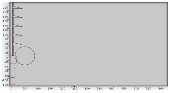Figure 1 refers to a two-dimensional (2D) geometry model of a 132 kV non-ceramic insulator and its corona ring. The measurements of the insulator string were developed in the software based on the available datasheet from a selected manufacturer. Both ends of the insulator were made with iron and top iron was connected to the ground end while the bottom end was supplied with a 132 kV applied voltage. The complete model was surrounded with air to evaluate the distribution of the electric field magnitude on the insulator surface. The outer air boundary was set to zero charge to model an infinite air region as a limited region. Table 1 shows the dimensions of the insulator string developed in this work.