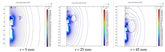 The results indicate that the highest electric field is not all the time at point 116, but it differences are according to the dimensions and position of the corona ring. The nearer the corona ring is to the insulator, lower the fields in the area near to the end-fitting. However, the fields along the sheath far from the end-fitting are higher for smaller diameters. There is a small impact on the electric field magnitude at the energised end when increasing or decreasing the ring diameter compared to the ring position. From Figure 10, it can be seen that the electric field at point 116 is decreased when the diameter of the ring tube, r, is increased. A contour figure is shown in Figure 11, which shows the variation in r and the changes in the electric field.