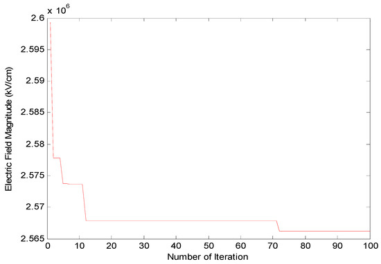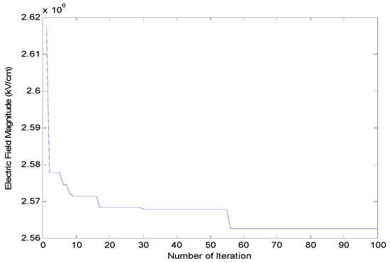 In order to explain the mechanism of each of the optimisation methods, Figure 13 and Figure 14 are referred to. The electric field magnitude is converging towards the minimum value against the iteration. For GWO, the process of searching begins with generating a random population of grey wolves, or the solutions of the candidates, which in this case are the diameter of the ring tube, ring diameter and vertical position of the ring along the insulator. The solution of every population, which is the electric field magnitude, is calculated. At every iteration, the alpha, beta and delta wolves are estimating the possible position of the prey. Every candidate updates its distance from their prey. The exploration and exploitation of the best solution are emphasised. The best solution is achieved when the distance between the wolves and their prey is converging.