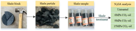 Shale outcrop rock samples were collected from the Fuling area, Sichuan Basin. Organic carbon was determined according to the GB/T19145-2003 standard []. The organic carbon content lies between 0.47% and 3.06%, with a mean value of 1.56%. We prepared the sample according to the coal sample preparation method GB/T474 []. Firstly, the shale is crushed to pieces with a particle size of 10–20 mm. Second, an ST-E200 table jaw crusher was used for crushing the shale samples, and the 60–80 mesh powder was screened out. Then, the powder was dried in a constant temperature oven at 80 °C for 24 h. Finally, the dried sample powder is equally divided into four groups, each group is 30 g, and one group of the untreated sample is reserved as the reference group.