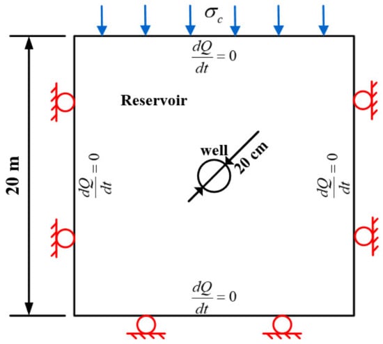 Figure 3 illustrates a plane-strain geometric model established according to the actual occurrence conditions of CO2 in shale. The model is a 20-m square with a 20-cm diameter well at the center. The boundary conditions of the CO2-bearing shale reservoir are as follows: (1) uniaxial strain; (2) constant overburden stress at the top boundary; (3) the wellbore pressure is applied at the boundary of well; (4) no flow condition is applied at other boundaries.