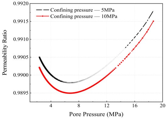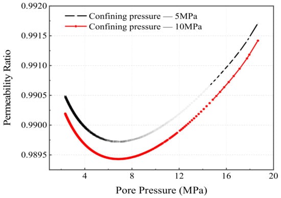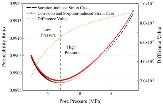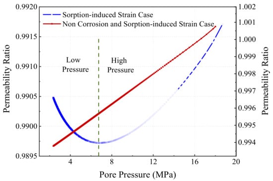 Figure 4 illustrates the permeability evolution of CO2-bearing oil shale based only on an adsorption-induced strain case. In a non-corrosion and sorption-induced strain case, the permeability of CO2-bearing oil shale increases linearly. In an adsorption-induced strain case, the permeability decreases with increasing pressure under low pressure. However, under high pressure, the permeability increases with increasing pressure. This phenomenon occurs because, in the low-pressure area, the internal pores of shale are considerably affected by adsorption expansion, decreasing shale permeability with increasing pressure. However, in the high-pressure area, the influence of adsorption expansion strain on shale pores gradually weakens with the increase in pore pressure, and the shale permeability gradually recovers. Therefore, the evolution trend of the high-pressure zone is the same as that non-corrosion and sorption-induced strain case: the evolution of permeability increases with increasing pore pressure. Wang et al. and Robertson and Christiansen [,] also found that as pore pressure increases, permeability decreases at low pressure but increases at high pressure. Thus, our result is consistent with previous experimental results.