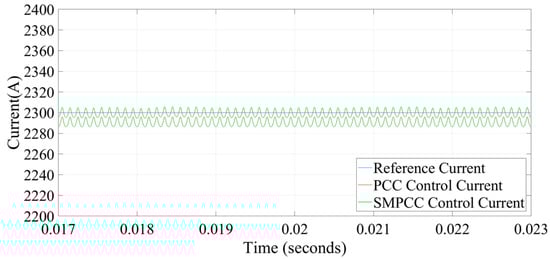 The gain of the state observer in the simulation. In Figure 3, the steady-state current analysis shows the output reference current and output control current of traditional PCC and SMPCC. The average output control current of traditional PCC is 2290 A, while that of SMPCC is 2299 A. The output control current of traditional PCC has a certain tracking error, while SMPCC can eliminate the steady-state error well, and it can accurately track the reference current. Through the comparative analysis of the simulation results, under ideal conditions, it can be found that after using SMPCC, the output control current steady-state error is reduced, so the steady-state performance is improved.