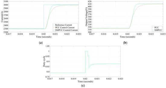The output reference current increases at 0.02 s from 2300 A to 3000 A when the input voltage is unchanged; Figure 4 shows the simulation. From Figure 4a, it can be found that when the output reference current increases suddenly, the system response will lag by one cycle, which is the inherent control delay. The output control current is quickly adjusted to 3000 A and into a steady state. The total adjustment time (rise time plus adjustment time) of SMPCC is shorter than that of traditional PCC, indicating that the controller of SMPCC has a faster response speed. From Figure 4b, it can be found that the output voltage of traditional PCC is adjusted quickly to 409 V, while the output voltage of SMPCC can be adjusted faster to the theoretical value, which is 411 V. The duty cycle change diagram of M1 and M4 in SMPCC is shown in Figure 4c. In order to keep the output of the controller stable, it can be found that a larger duty cycle is given at 0.02 s. The duty cycle will not change significantly after the output is stable, and with the system fluctuation, it will change in real time. The theoretical value of the duty cycle is smaller than the actual value because there is a certain voltage at the parasitic resistance. The difference between the output voltage obtained from the actual value of the duty cycle minus the voltage at the parasitic resistance is basically consistent with the actual output voltage.