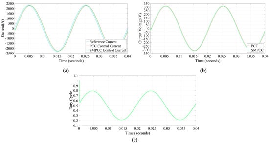 When the input voltage is unchanged, Figure 5 shows the simulation waveform by tracking sinusoidal current as an example. It can be found from Figure 5 that the output control current smoothly reverses. The output reference current is sinusoidal when the input voltage is unchanged; Figure 5 shows the simulation. It can be found from Figure 5a that when the output reference current is sinusoidal, the response of the system will lag by one cycle, which is the inherent control delay. Soon, the output control current can change sinusoidally when the output reference current changes, while the controller of SMPCC has a faster response speed. From Figure 5b, it can be found that the output voltage of traditional PCC can also change sinusoidally soon when the output reference current changes, while the controller of SMPCC has a faster response speed as well. Figure 5c shows the duty cycle change diagram of M1 and M4 in SMPCC. It can be found from Figure 5c that when the output reference current is sinusoidal, the controller will give the duty cycle of sinusoidal change at this time due to the sinusoidal change of output voltage, and with the system fluctuation, the duty cycle will change in real time.