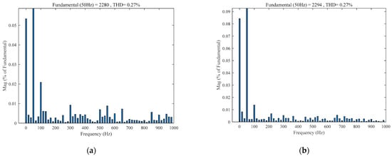 Fast Fourier transform (FFT) analysis is conducted for the output current of the two methods. Figure 6a and Figure 6b show total harmonic distortion (THD) analysis of the output current waveform under traditional PCC and SMPCC, respectively. The fundamental wave content of the output current in Figure 6a is 2280 A, and the THD of the output current is 0.27%, while that in Figure 6b is 2294 A, and the THD of the output current is 0.27% as well. Comparing Figure 6a and Figure 6b, it can be found that the output current fundamental wave content of SMPCC is closer to the output reference current value than that of traditional PCC, and the THD of SMPCC is the same as that of traditional PCC. Through the comparative analysis of the results, it can be found that under ideal conditions, the output current steady-state error is reduced, and the system’s steady-state performance is improved after using SMPCC.