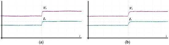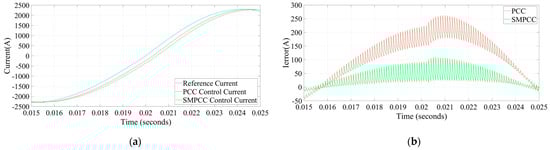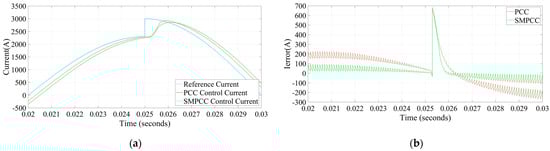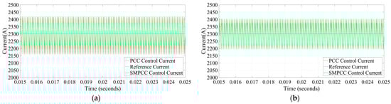 In addition to the steady-state performance comparison, Figure 13 presents the dynamic response of traditional PCC and SMPCC to sudden changes in the output reference current. In Figure 13, the output reference current is suddenly added from to , Figure 13a is the output reference current response waveform under traditional PCC, and Figure 13b is the output reference current response waveform under SMPCC. Comparing the output current responses of the two control methods, it can be found that after the output reference current changes abruptly, the steady-state error of SMPCC is smaller than that of traditional PCC, and the corresponding speed is faster, which is consistent with the situation in the simulation.