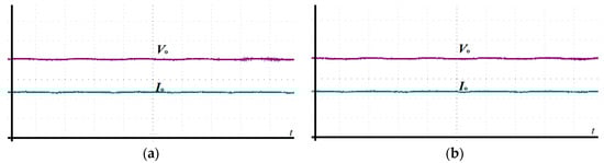 Figure 14 shows the dynamic response of traditional PCC and SMPCC when the output reference current is sinusoidal and the output reference current is . Figure 14a shows the output voltage and output control current response waveform under traditional PCC, and Figure 14b shows the output voltage and output control current response waveform under SMPCC. According to the output current response of the two control methods, the output control current of traditional PCC and SMPCC smoothly reverses when the output reference current is sinusoidal, which is consistent with the situation in the simulation.