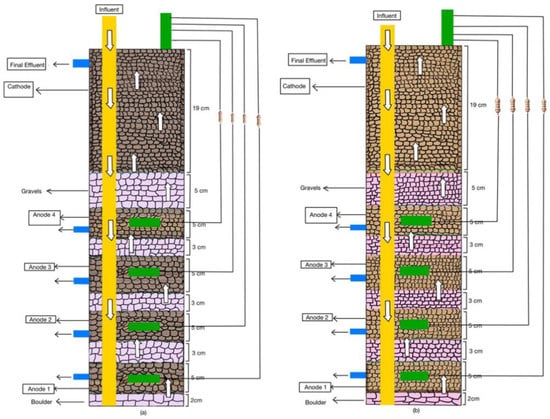Two equally sized CW-MFCs were built using polyvinyl chloride pipes of 57 cm height and 11 cm diameter and named CW-MFC (GG) and CW-MFC (GAC), as shown in Figure 1a,b. The CW-MFC (GG) was fabricated using graphite granules of sizes 5–8 mm as electrode material, whereas another CW-MFC (GAC) was equipped with electrodes made up of activated charcoal granules of sizes 5–8 mm. The total working volume of each system was 2 L. Each CW-MFC microcosm consists of four anodes (anode 1 (A1), anode 2 (A2), anode 3 (A3), and anode 4 (A4)) and one cathode. In the bottom of PVC pipes, a 2 cm thick boulder (10–12 mm) layer was placed. Above this layer, a 5 cm-thick layer of granular graphite or activated charcoal was placed as anode 1 for the fabrication of CW-MFC (GG) and CW-MFC (GAC), respectively. This layer was separated with a 3 cm-thick layer made up of a double-layered perforated plastic liner and stone gravels 5–8 mm in size. Likewise, three more anodes were fabricated. The anodic and cathodic zones were separated with a double-layered plastic liner, glass wool, and stone gravels measuring 0.2–0.5 cm. Plastic liners were provided with 2–3 holes in them for proper passage of wastewater. Thereafter, a 5 cm layer of gravel was placed as a separator between the anodic and cathodic zones. Above this, a 19 cm-thick layer of granular graphite or activated charcoal granules is placed to act as a cathode. One graphite rod of 100 mm × 13 mm (length × width) was connected with an electrical wire is placed in each electrode as a charge collector or dispenser. All four anodic zones were provided with an anode sampling point from the anode, i.e., A1: 54 cm; A2: 46 cm; A3: 38 cm; and A4: 30 cm in both systems, whereas each microcosms cathode is fitted with one effluent port at 7 cm from above. In both CW-MFC microcosms, all four anodes were separately connected to the cathode using an external resistance of 1 KΩ in a parallel manner.