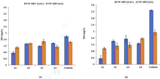 Dissolved oxygen (DO) is one of the crucial factors that play a key role in the performance of CW-MFC. The dissolved oxygen concentrations (mg/L) observed during the course of study for CW-MFC (GG) and CW-MFC (GAC) are depicted in Figure 2a,b. In CW-MFC (GG), the DO concentrations were observed in the range of 1.09 ± 0.05 mg/L to 1.43 ± 0.07 mg/L from A1 to cathode at an organic loading rate of 890.11 g COD/m3-d. Similarly, in CW-MFC (GAC), it ranged from 0.75 ± 0.06 to 1.78 ± 0.1 mg/L from A1 to the cathode. For an organic loading rate of 1781.32 g COD/m3-d, DO levels were ranged from 0.96 ± 0.1 mg/L to 1.94 ± 0.07 mg/L from A1 to the cathode in CW-MFC (GG) whereas for CW-MFC (GAC), it ranged from 0.35 ± 0.04 mg/L to 3.28 ± 0.3 mg/L starting from A1 to the cathode. The DO levels significantly vary across both up-flow CW-MFCs. For both organic loading rates, the DO levels were found higher in the cathodic zone as compared to the anodic zone in CW-MFC (GG) as well as in CW-MFC (GAC). This can be attributed to the diffusion of air into the cathodic zone from the atmosphere, and since wastewater has a low organic matter content as it flows upward from the anodic zone to the cathodic zone, it no longer consumes the DO present in the wastewater. The DO concentration usually tends to be higher in the upper region and comparatively lower in the lower region across an up-flow CW-MFC []. At the anodic region, a higher rate of oxidation of pollutants facilitates more electron transfer to the cathodic region, which in turn speeds up the rate of reduction reactions at the cathode. This accelerates oxygen diffusion at the cathode, resulting in higher DO concentrations at the cathode. It was also observed that DO levels were slightly higher in CW-MFC (GAC) as compared to CW-MFC (GG), which indicates more COD removal in CW-MFC (GAC). The DO concentration at the lower anode decreased when organic loading was increased for both electrode materials because oxygen was consumed in the degradation of the organic substrate. The pH profile is also considered an important operative variable due to the possible effect of pH variation on electroactive bacteria []. The pH was found to be in the range of 4.2–6 for both of the microcosms during the course of the experiment. The pH was found to be decreased as the organic loading rate increased.