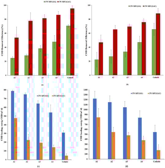 Additionally, Figure 3c,d were also drawn to show COD loading rates starting from A1 to the cathode in CW-MFC(GG) and CW-MFC(GAC) to represent degradation of organics at each stage for an organic loading rate of 890.11 g COD/m3-d and 1781.32 g COD/m3-d during the course of the experiment. It is clearly evident from Figure 3a–d that the COD loading rate is consistently decreasing as the wastewater passes from A1 to cathode for both organic loading rates.