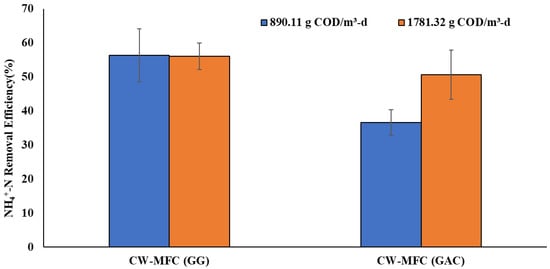 Furthermore, in the case of CW-MFC (GAC), higher ammonium removal can be observed with an increase in load. However, the increase in load from 890.11 g COD/m3-d to 1781.32 g COD/m3-d has decreased the DO availability from 0.75 mg/L to 0.35 mg/L in CW-MFC (GAC). This decrease in DO levels will increase the competitiveness between nitrifiers and heterotrophs for available oxygen, which could limit ammonium removal with an increase in organic load []. Further study is needed to explain such results. Although this indicates the crucial role of conductive material and the possible efficiency of electron conductivity as a deciding factor in ammonium removal even at high organic loading rates. Furthermore, the implementation of multiple anodes has increased the electrode surface area and enhanced attachment sites for microbes, which is further responsible for high ammonium removal efficiency. CW-MFC (GAC) has shown an increase in ammonium removal with an increase in organic loading rate, while it is consistent in the case of CW-MFC (GG). This may be due to the increase in DO level in the cathodic region of CW-MFC (GAC) during that phase because of some unforeseen/unexplainable reasons, as shown in Figure 2. As depicted in Figure 4, under both organic loading rates, CW-MFC (GG) showed better NH4+-N removal than CW-MFC (GAC). This may be explained by the fact that graphite acted as a better electron acceptor than charcoal to accept the electrons released in the process of NH4+-N oxidation.