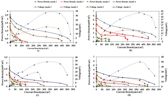 Polarization curves for (a) CW-MFC (GG), (b) CW-MFC(GAC) at an organic loading rate of 890.11 g COD/m3-d, (c) CW-MFC (GG), and (d) CW-MFC (GAC) at an organic loading rate of 1781.32 g COD/m3-d.