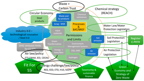 A very interesting concept to implement sustainability into the steel industry is the so-called Green Steel. Green technology is the application of environmental and technological solutions to model, monitor and conserve natural resources and the environment and reduce the negative impact of human activities [64]. The implementation of these principles into the steel industry can be called green steel [65]. The conception is closely related to a strategy to make a potential production of so-called decarbonized steel. Due to large investments into innovative technologies, industry should go towards decarbonisation of the production processes. Endorsing the wrong option and not investing in that technological solution should lead to a situation when the industry will lock in carbon-intensive usage of energy and can be prematurely closed because they will not meet the future climate requirements and may face big carbon emission costs [66]. The Fit for 55 packages announced last year, currently in the process of negotiating legislation, aims to accelerate decarbonisation, including the phase-out of free emission allowances and the introduction of a carbon CBAM. Legislation for the steel sector in Poland is extensive (Figure 1).